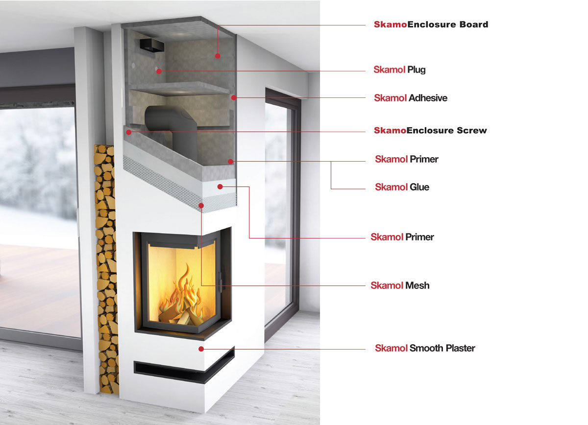 SkamoEnclosure Board służy do budowy kominka, będąc jednocześnie jego izolacją. Tworzy lekką oraz sztywną konstrukcję i jest łatwa w obróbce przy użyciu tradycyjnych narzędzi stolarskich. Płyta do zabudowy kominka Skamoenclosure jest doskonałym izolatorem wysokich temperatur panujących wewnątrz obudowy kominkowej, zapewnia bezpieczny ich poziom po stronie zewnętrznej. Idealnie nadaje się do izolacji belki drewnianej, ścianek bocznych oraz ściany za kominkiem.
